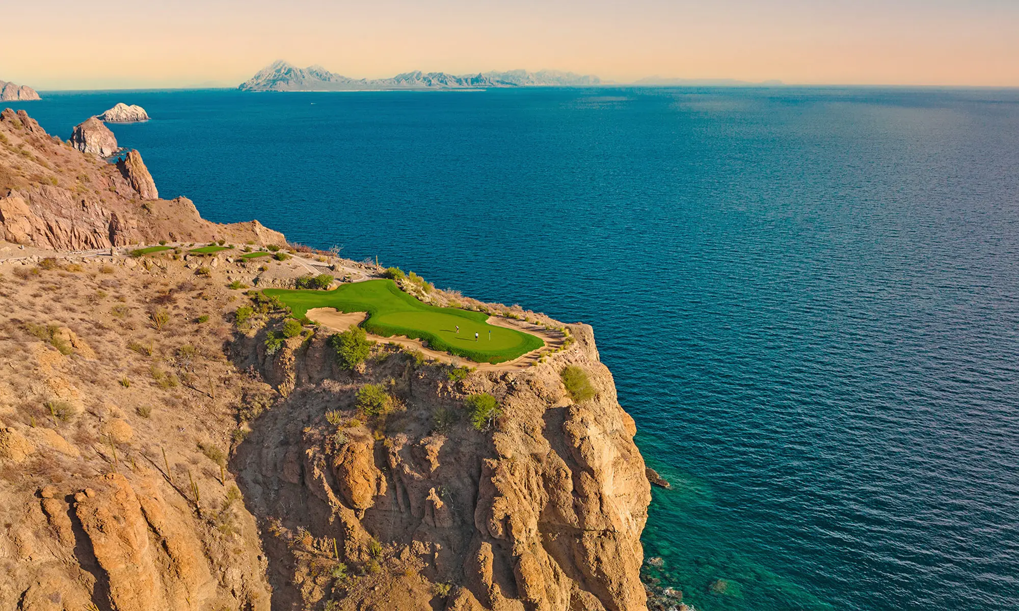 In Loreto, TPC Danzante Bay offers a dramatic contrast to Cabo’s bustle. Designed by Rees Jones, the course moves through arroyos, canyons, and ridgelines before reaching the Sea of Cortez. Its 17th hole, perched above a rocky cove, has become one of Mexico’s most photographed par threes. Rates generally range from US$200 to US$300, including practice access and transportation from nearby resorts. The course anchors the Villa del Palmar resort community, reinforcing Loreto’s growing reputation as a destination defined by quiet elegance and natural drama.